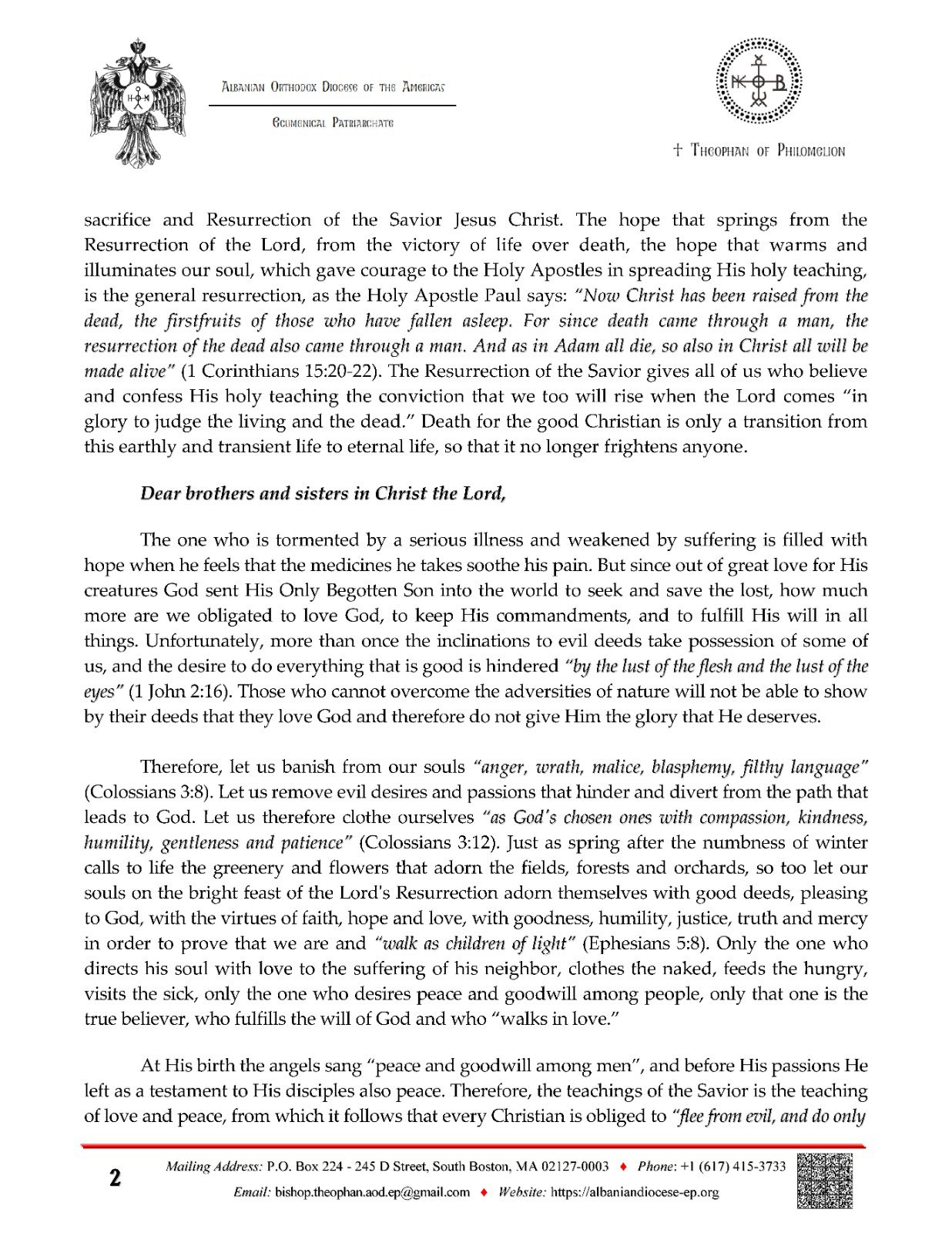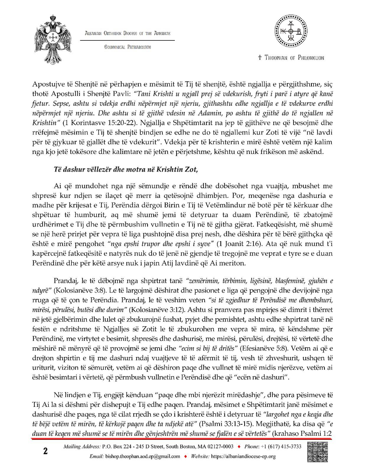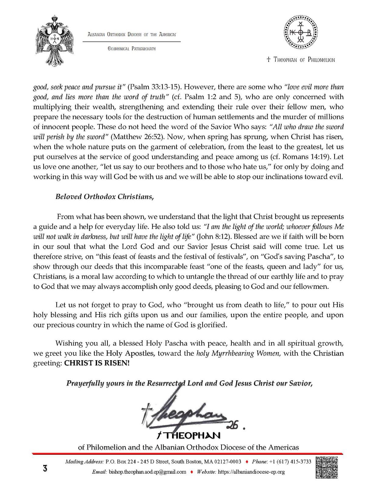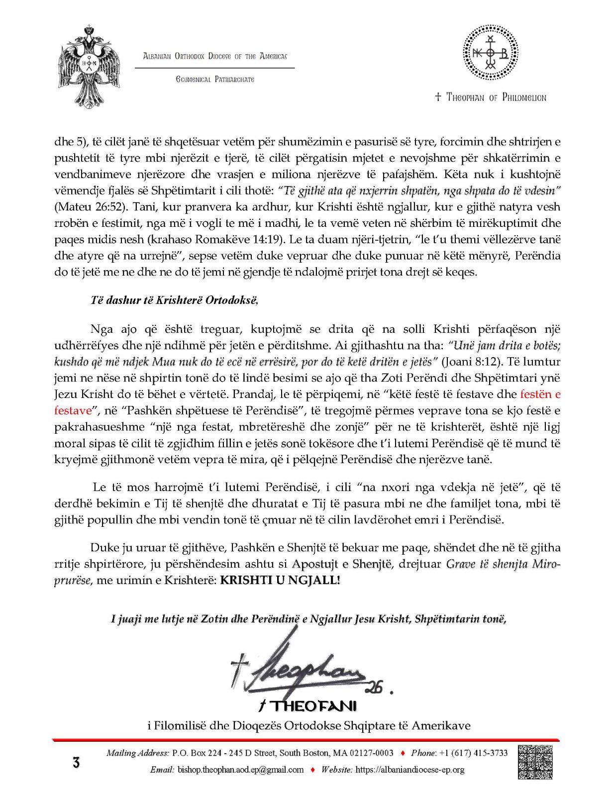 Me këto ndjenja, vëllezër tepër të çmuar dhe fëmijë të dashur, të mbushur me gëzimin e plotë të pjesëmarrjes në "festën që ndahet nga të gjithë", pasi morën dritë nga drita e pambarimtë dhe i dhanë lavdi Krishtit të ngjallur prej së vdekuri dhe u dha jetë të gjithëve – edhe kur kujtojmë gjatë kësaj “dite të zgjedhur dhe të shenjtë” gjithëfestive të gjithë vëllezërit dhe motrat tona në rrethana të vështira – i lutemi Zotit tonë “i cili e shkeli vdekjen me vdekje”, Perëndisë së paqes, që të sjellë paqen në botë dhe të drejtojë hapat tanë drejt çdo vepre që është e mirë dhe e pëlqyeshme për Të, duke shpallur himnin e gjithëgëzueshëm "Krishti u Ngjall"!