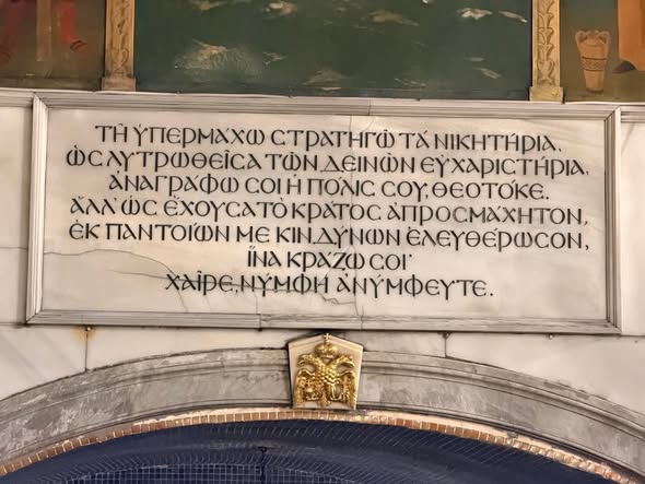 “Ty, o Përlufteshësja jonë Gjenerale, ne, Qyteti Yt, të drejtojmë himne fitoreje dhe falenderimi, që na shpëtove prej tmerreve, o Hyjlindëse!”