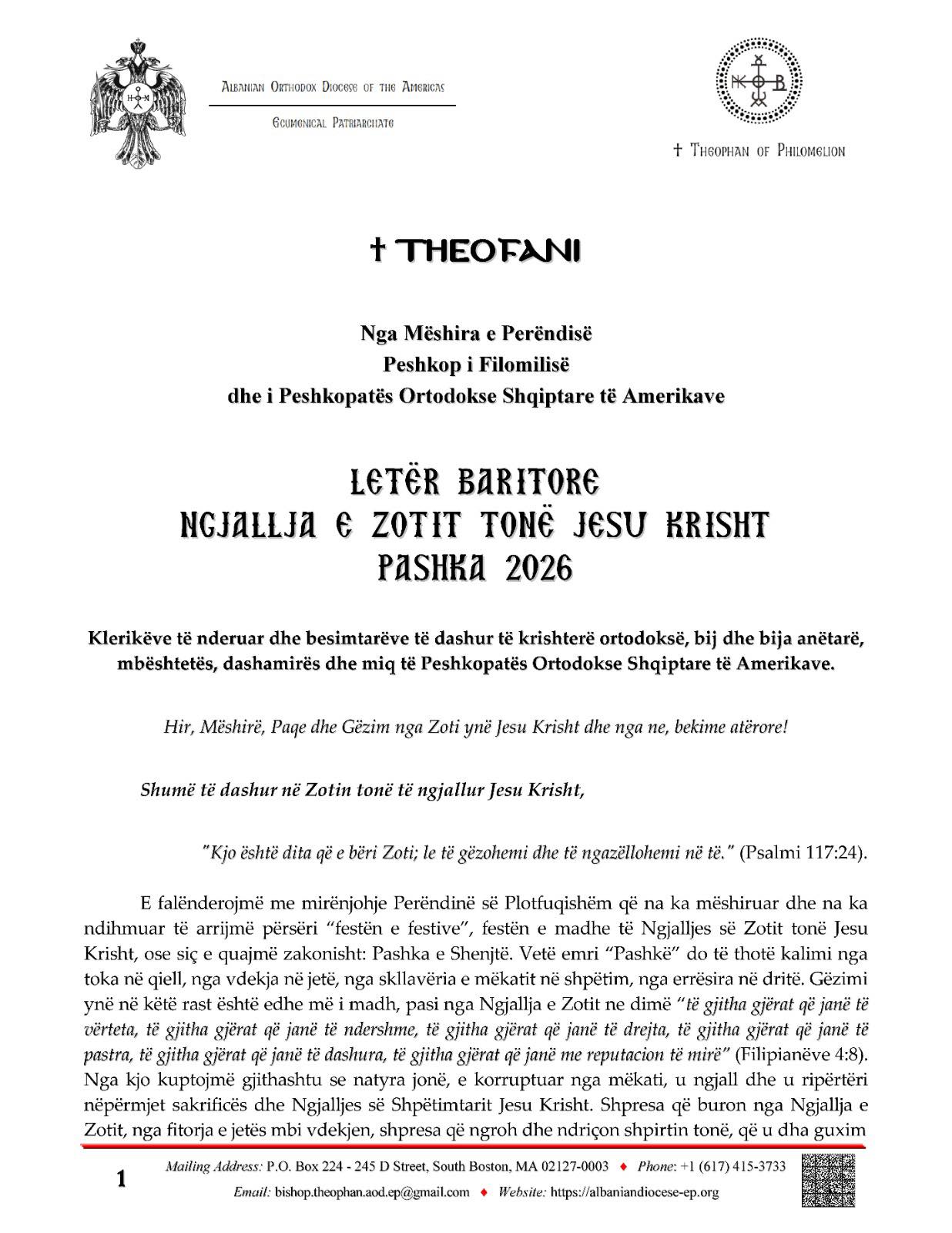 Pasi mbërritëm, nëpërmjet kreshmimit, lutjes dhe solemnitetit, në ditën e ndritshme dhe gjithëfestive të Pashkës së Shenjtë, ne himnizojmë dhe lavdërojmë Ngjalljen shpëtuese të Zotit, Perëndisë dhe Shpëtimtarit tonë Jisu Krisht, e cila shënon fitoren e dukshme të jetës mbi vdekjen, ripërtërin gjithë krijimin dhe i hap njerëzimit rrugën e hyjnizimit me anë të hirit. Kisha e Krishtit ruan përvojën paskale në jetën e saj liturgjike, në përpjekjet e Shenjtorëve dhe Martirëve të besimit, në impulsin eskatologjik të murgërisë, në shpalljen e Ungjillit “deri në anët e fundme të dheut”, në teologji dhe artet kishtare, në dëshminë e mirë të besimtarëve në botë, në kulturën e dashurisë dhe solidaritetit dhe në sigurinë e palëkundur se e keqja nuk e ka fjalën e fundit në histori.